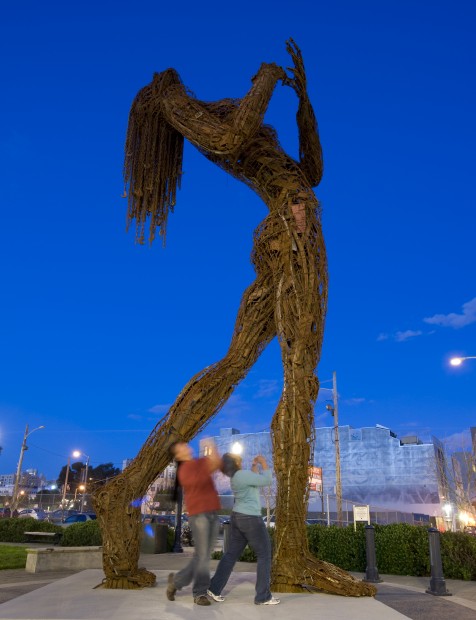 Made from salvaged and recycled steel, this six ton, 30 foot tall work retains its’ environmental message. Through much of their work, artists Dan Das Mann and Karen Cusolito resolve to use reclaimed materials, exemplifying resourcefulness as part of the creative process and challenging our cultures consumerist tendencies. Found objects, structural steel scrap, and old machine and car parts comprise Esctasy’s body; the strands of her hair are retired lifting chains. Her structural armature is made of 10″ schedule 40 pipe, harvested from a disused factory in Oakland, Ca.
