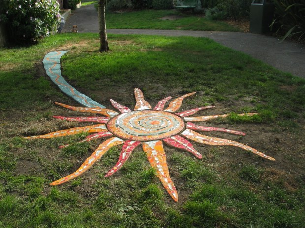 These colorful, found-objects mosaic were inspired by flowers and the sun. The pieces were carefully patterned along the ground throughout the park and nested amidst the grass and natural settings where folks walked, sat and picnicked on the mosaics.