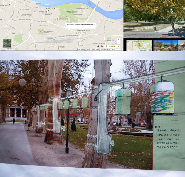 Artists’ rendering of 2014 Grantee project, 24 Sound Cylinders. Strung between trees, each of these 24 cylinders contains a set of metal rods that create a soothing sound when struck in succession. Through a complex system of pulleys, people are able to turn cranks that rotate a circular percussive mechanism, inside each cylinder, that plays the rods, resulting in a chorus of pleasing tones. This project debuts at Croatia’s free arts festival.