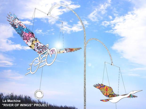 Artists’ rendering of 2014 Grantee project, River of Wings. River of Wings (ROW) is comprised of kinetic, avian inspired sculptures, each one reimagined and personalized by members of the community. In the fall of 2014, the “flock” will be installed along a half mile section of the bike path of the L.A. River. Each perch will be equipped with a solar light, illuminating not only the visually stunning birds, but also the bike path transforming the space into a safe welcoming environment for cyclist, pedestrians, and families. Sprinkled throughout the installation of 60 birds, there will be 20 birds equipped with sculptural elements that create a sonic experience with music or sound activated by the visitors and the natural forces of winds, light, and heat. As visitors traverse the space, they will activate the movement of the wings, read messages written by the community, create their own sonic imprint, and enjoy the diverse artwork of each bird. From afar, the dancing wings mesmerize Angelinos, tempting them to descend into the natural oasis where city-dwellers reconnect with the earth and their city. Up close, the flock of birds in flight will give the impression that you are soaring with the birds, giving Angelinos an invigorating sense of movement and freedom. Even driving by, the River of Wings will captivate your imagination and disrupt the ordinary making that moment extraordinary. According to North American Natives, the Blue Heron, an icon of the LA River, brings messages of self- determination and self-reliance and represent an ability to progress and evolve. In sync with local and national efforts to restore the river to its natural state, ROW gives artists, students, and groups an opportunity to make their mark and give voice to their dreams and hopes for the LA River. Under each bird, will be a cutout attached with words chosen by each artist/group. These words root the experience in the sense of dialogue and personal impact.