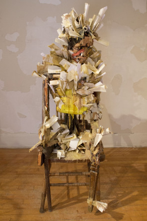 2014 Grantee project, Traveling Memory Holder. The Traveling Memory Holder (TMH) is a mobile assemblage sculpture that will be pushed along the sidewalk of a route across Brooklyn and Manhattan. People will be invited to contribute a writing about their favorite memory. The memories will then be posted on walls and digitized for public display. This seated figure is constructed from locally found objects. Wheeled among the sidewalks of Brooklyn and Lower Manhattan, the artists invite passers-by to write down their favorite memory. They then place their memory in one of the figure’s empty spaces and pour warm wax over the memory, sealing it to the TMH. For the first several days the memory holder will seem to be decorated by the papers, but as weeks pass the memory holder will resemble more a giant cluster of memories with no visible figureWhen the figure is full of memories, a ceremony is held in a public space where several volunteers will use hair driers to melt the wax and remove the memories, attaching them, one by one to plywood walls. These walls are then erected for several weeks in two or more public spaces in Brooklyn and Manhattan. Visitors will be able to read the hundreds and maybe thousands of memories of their neighbors throughout their city. Finally, the memories are digitally archived and made available online for perusing by the public.