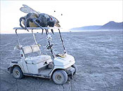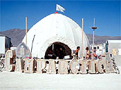 The Gerlach shuttle service provides a different type of challenge. Because we operate on public roads, our shuttle carrier must have the appropriate commercial license and insurance to run this sort of service in Nevada. The local “casino bus”-type operators, however, would be a very uncomfortable cultural fit for our event. We have been thrilled with our partnership with The Green Tortoise, which has been able to save us the cost of transporting the shuttle buses to the playa by using those same buses to transport non-car-driving citizens to our event. To accommodate those riders who would otherwise have access to the buses for storage, relaxation, sleeping, etc. during the day, we provide the Tortoise camp with a container for storage of their passengers’ goods and a shade structure for lounging. Gardner Kent, the founder of the Tortoise, is a kindred spirit and a particular fan of Burning Man (it’s a mutual admiration society). As any of you who have ridden the Shuttle will attest, the Tortoise drivers are perfectly culturally suited to the task of transporting our motley community back and forth between our playa home and the pay phones and cash registers of Gerlach and Empire.