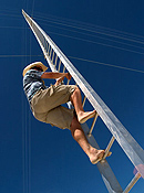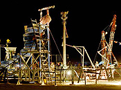 In 2005 the communitys Temple again appeared in its usual position behind the Man. David Best passed along the task of creating the Temple of Dreams to his crew member, Mark Grieve. Mark and the crew created lovely red Japanese-style pagodas, which were constantly in use. As always, shrines, altars, photos, and written tributes accumulated in the Temple grounds throughout the week, making it once again the communitys sacred place of grieving and remembrance. Another massive collaborative project was Seattles Machine, a huge and complex wood and metal structure containing an elaborate system of gears and conveyor belts. At least sixteen artists participated in its design, planning, and execution, and they were joined by dozens more workers to bring it to life. The action of participants turning three “people wheels” caused its huge arms to rise to great height before the entire installation was pulled down. The Machine proved stronger than puny humans, however, and after participants failed to bring it down, the Department of Public Works (DPW) stepped in to assist with heavy machinery.