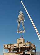 Some fabrication and assembly has taken place at the Black Rock Station work ranch in the past, but the complexity of the 2005 structure meant that it had to be mostly prefabricated so that on-site assembly could be compressed into the first week of site occupancy. In fact, the main tower was up in 3 days! This great success allowed the Man to be lifted into place several days earlier than in the past so that the turning mechanism could be installed and finely tuned.
