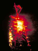 - As Burning Man is lifted into place by participants, the legs and pelvis break away. The figure is burned in a semi-erect position.