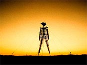 It was my first view of Burning Man, as he stood upright, rising 40 feet into the surrounding skyline. It was an incredible vista. The statue stood there in contradiction to its environment completely surrounded by asphalt, concrete, brick and steel, the modern facades of our society. Its shape was a beacon to another time and space that spoke eloquently of ritual, sacrifice, and homage. I stared at the statue and it was love at first sight, for I knew this was something special and demanded a dedication and a commitment beyond the pale of typical societal activity. As I viewed the statue, it was the beginnings (for me) of an attraction that would span over time (1 decade and counting), space (from a S.F. beach to a dried lake bed in a Northern Nevada mountain range), and activity, from helping to build, plan and promote Burning Man to its surrounding community. I met Larry Harvey and Jerry James, the creators and organizers of Burning Man who at that moment were very busy directing its construction, for what was now its fifth reincarnation. Having seen the statue, I knew I wanted to help and we agreed to talk later on about my potential contribution to the project.