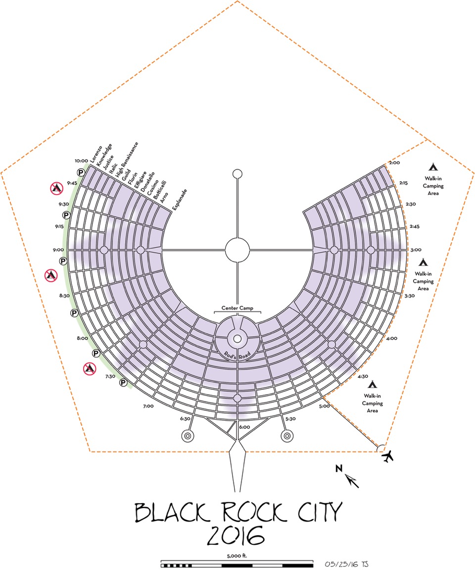 The radial streets of Black Rock City are named by their clock position. The light blue shaded area does not specify, but rather approximates, where you will find reserved-placement camps: interactive theme camps, camps supporting art installations, and infrastructure camps. We’ve softened the edges of the reserved-placement shading here as this zone fluctuates greatly between this initial city plan and the final placed camp plan displayed at the event site.