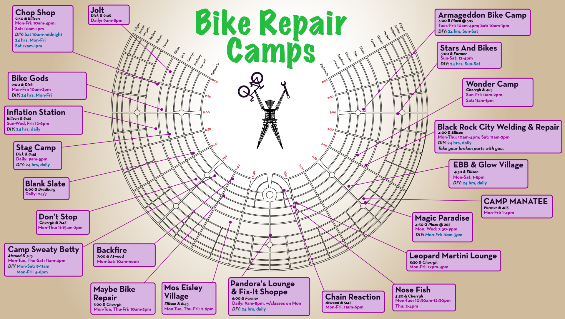 The radial streets of Black Rock City are named by their clock position. The light blue shaded area does not specify, but rather approximates, where you will find reserved-placement camps: interactive theme camps, camps supporting art installations, and infrastructure camps.