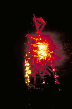 "The Man was presoaked with kerosene, his legs and body stuffed with newspaper and wrapper with burlap skin, also all soaked with kerosene. It was another blustery cold evening, and he was on fire and the burlap and newspapers blew away in ashes, but the Man, through charred, was still standing.