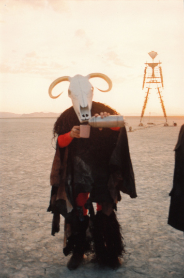 “… Then came 1993. I will never forget the sunset before the Burn. … the entire camp was arranged around a circle – a deliberate circling of the wagons. For me, that was the year it all came together. That one circle was our first street, and the prototype for what is now Center Camp. Remember, the entire encampment was smaller than today’s Center Camp. We held the formal cocktail party in the center of the circle — there was no cafe… cocktail party time. 1993. Sunset. Center circle. The clouds took on a brilliant magenta hue with orange highlights. The Man was lit, blue, to the East of us, standing taller than the mountains. We were all decked out, in our heinously formal jackets and gowns. I was watching the beautiful Calico Mountains to the west, with their streaks of white, orange and red soil. The sky cast a magical glow over the proceedings.