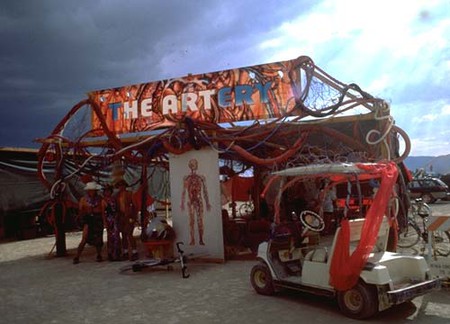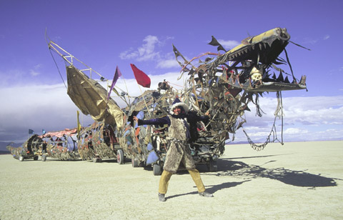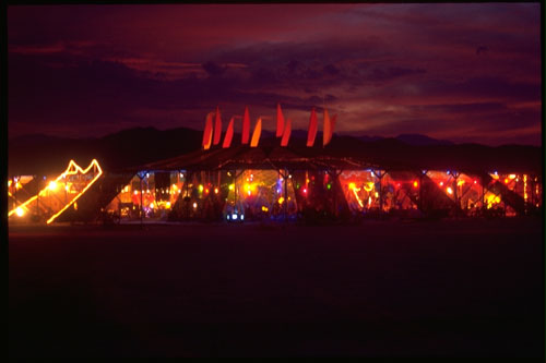 LH: You are naive. A certain kind of loudness is a part of the aesthetic. It's meant to penetrate your body. People bathe in the sound. Asking folks to turn it down is sort of a non-sequitur. This year we plan to restrict large-scale amplified sound of this kind to a very limited area. Installations of this kind must register ahead of time. People can go there and enjoy it, but there will be less of it. I have seen 6 or 8 people gathered in front of speakers the size of Volkswagens. But why should the enjoyment of 6 people afflict 600 others? Sound at such levels can travel forever in the desert, regardless of how you insulate it or how you orient your speakers. We recommend earplugs at the event. That and a very broad tolerance for other people's tastes. But even earplugs won't avail against that bass.