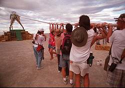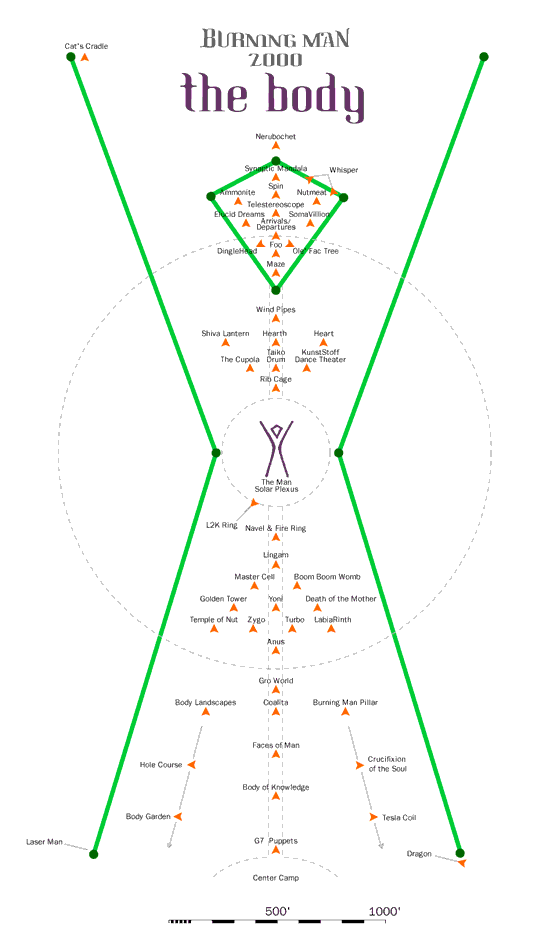 - Theme Art area continues to grow. Defining the area is an installation called "Laser Man" by Russell Wilcox of Lawrence Livermore Laboratories; projected by towers 30 feet above the playa, green lasers form the body of the Man in the shape of the logo. Along the "spine" of this pictogram are placed major works of art inspired by the human body, including the Burning Man at the Solar Plexus. Among these works: WHISPER by Christopher Carfi - a pair of parabolic dishes situated at the "ears" of the man - the tinest whisper into one dish could be heard at the other hundreds of feet away; RIBCAGE/BIRDCAGE by Jenne Giles and Philip Bonham, a 17 foot high 'birdcage' shaped like the human ribcage, complete with a swing where the heart would be; HEARTH by Sidney Klinge and Charles Smith, a popular 20' iron and steel heart which pulsed with fire and warmed participants at night; and ANUS by David Normal and Max Hunter, a sculpture of a 12' sphincter and two mighty squatting legs, through which participants could crawl.