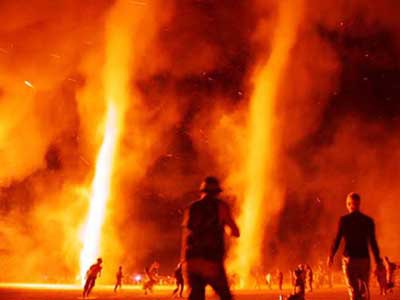 - The "ancestors" returned to the burn in the form of towering whirls of flame and smoke that spun off the base during the burn. Five hundred members of the Fire Conclave spun in the procession before the burn, some on elevated platforms to increase the visibility for the viewing audience.