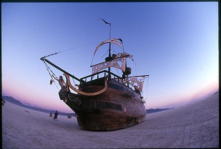 Burning Man turned seventeen in 2002, and everyone seemed to agree that this was a very good year. In fact, it may have been the best year yet. Ample springtime flooding smoothed the surface of the playa in 2002 and restored the burnished fractal crust of former years. Warmer nighttime temperatures allowed participants to rove across the surface of this fossil seabed as if drifting on a Gulf Stream current, and our theme, The Floating World, did much to further this impression. The prospect of imaginary seas produced a record catch of art works in 2002 and the sheer abundance of such projects lent a sense of mise en scené to the event, a charm made all the more evocative by the knowledge that so many people had independently joined together in creating it.