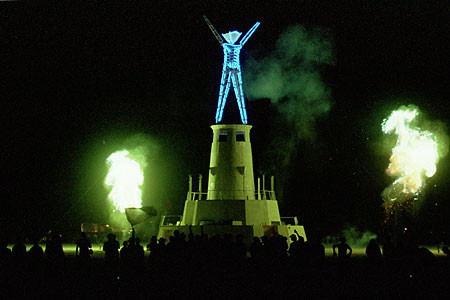 In 2002 our homecoming was marked by perfect weather, at least for most of us. ... The playa was not, however, as benevolent to the cleanup crew. On Tuesday, after most of us had gone, the worst dust storm in BM history swept in and stayed for three days, making cleanup operations extremely difficult. Despite the difficulties, though, we still earned high grades from the BLM in their annual post BM inspection tour. The playa was our sea and proudly we sailed forth into its uncharted dimensions, to discover ourselves and our Floating World, this year's theme. There were wooden ships on the water—very free and a few, very large—complete with singers, dancers, musicians and other performers. There was an art installation of silvery swimmers, whose strokes matched the rhythm of the playa wind. There were schools of fish and myriad arrays of aquatic creatures that came out at night to dazzle us with their brilliant lights. At the center of it all, the Man stood upon a 40-foot-tall lighthouse, beaming at us, for us, and with us. This year a treasure hunt was offered. In exchange for undergoing mysterious rites of passage at a variety of theme camps, adventurers received colored tokens, which they could parlay into gold doubloons...This year, the community stretched far onto the playa. The Temple of Tears, reborn as the Temple of Joy, was again an awesome presence. Burning Man 2002, like others before it, was a synthesis of survivalism and radical self-expression, a ballet of dust and dreams. We brought fire; we brought water, and we brought gifts to share. Read more