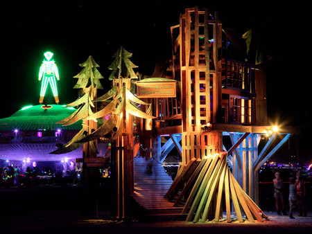 Notable art installations for 2013 included Bryan Tedrick’s “Coyote”, The Flaming Lotus Girls’ “Xylophage”, “Truth is Beauty” by Marco Cochrane, and “BELIEVE” by Laura Kimpton and Jeff Schomburg. First-time Burning Man artists also made a significant impact, including Mike Garlington with his hauntingly beautiful “Photo Chapel”, and the stunning “Church Trap” by Rebekah Waites.