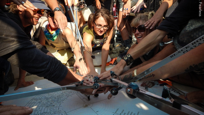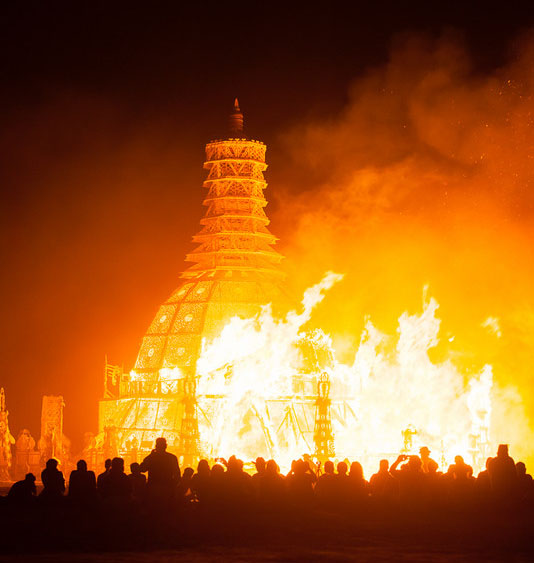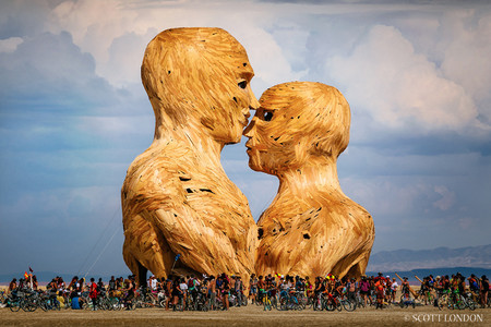 Burning Man awarded more than $800,000 in honorarium art grants to support creation of 61 art installations in 2014, while more than 250 self-funded artworks were built and displayed in Black Rock City by artists from around the world. Dominating the skyline was “Embrace”, a 72’-tall wooden sculpture depicting two people locked in a hug, by Matt Schultz and the Pier Group. It was set alight in an unusual dawn burn on Friday of the event.