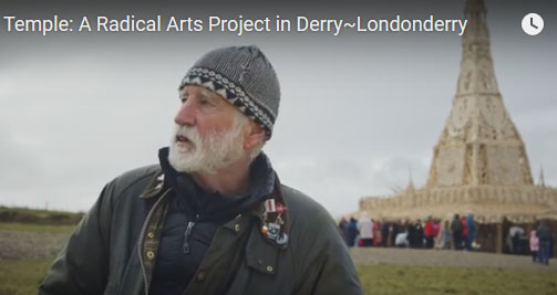 In March, The Artichoke Project and David Best, with an international crew, built "Temple" in Northern Ireland. The ethos of the Temples of Burning Man was brought to Derry LondonDerry in a timber frame structure measuring 72 ft tall, clad with intricate panels, some of which had been designed and cut by young people in the Nerve Centre's Fablab. Everyone was invited to leave a memory behind, let go of the past and look to the future. Up to 60,000 people visited over the seven days it was open, covering the inside of the structure and it's pillar with personal messages. On Saturday the 21st March it was set alight at 8pm and 15,000 people watched Temple burn.